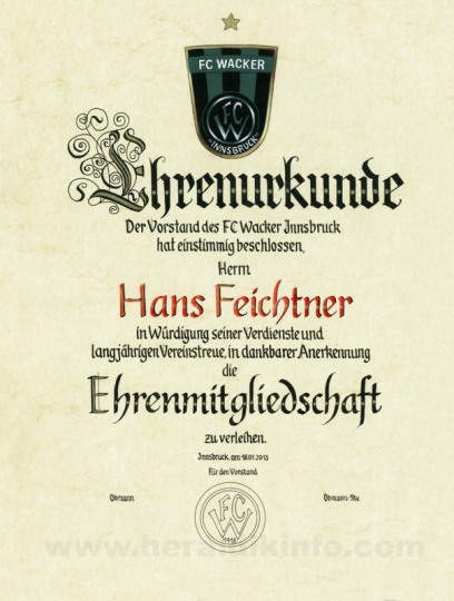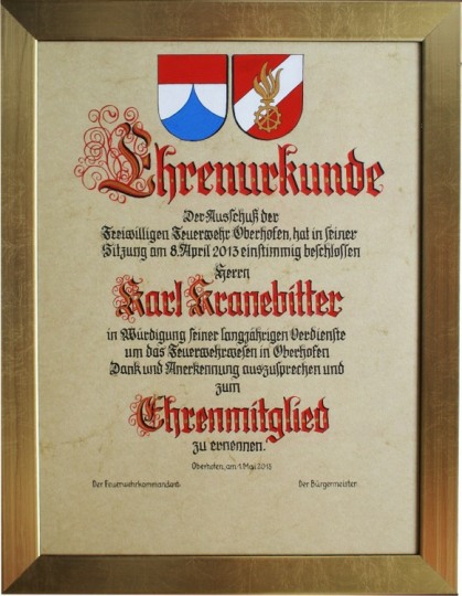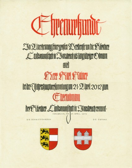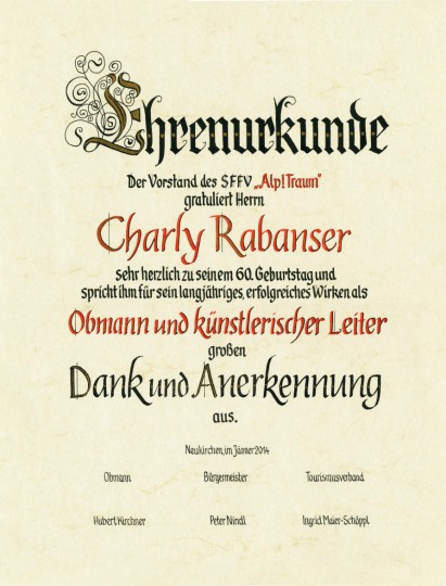 Die Herstellung einer Ehrenurkunde ist eine häufige Anwendung der Kalligrafie. Überreicht als Ausdruck besonderer Wertschätzung, Dank, Anerkennung oder Bestätigung besonderer Leistungen. Beschreiben Sie Umfang und Inhalt, Sie erhalten einen unverbindlichen Vorschlag und ein Angebot!